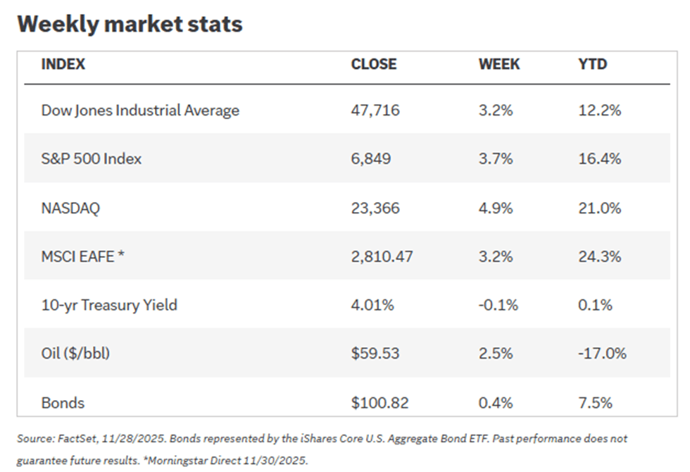• S&P 500 Finish: The S&P 500 finished the month with a slight gain (approximately 0.2-0.3%). This performance helped confirm the historically supportive post-Thanksgiving seasonal trends, which typically point to a strong year-end finish (December has averaged about a 1% gain over the past 30 years).